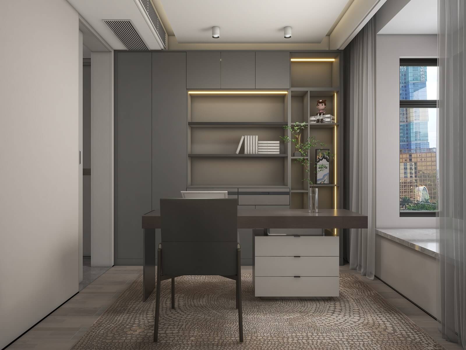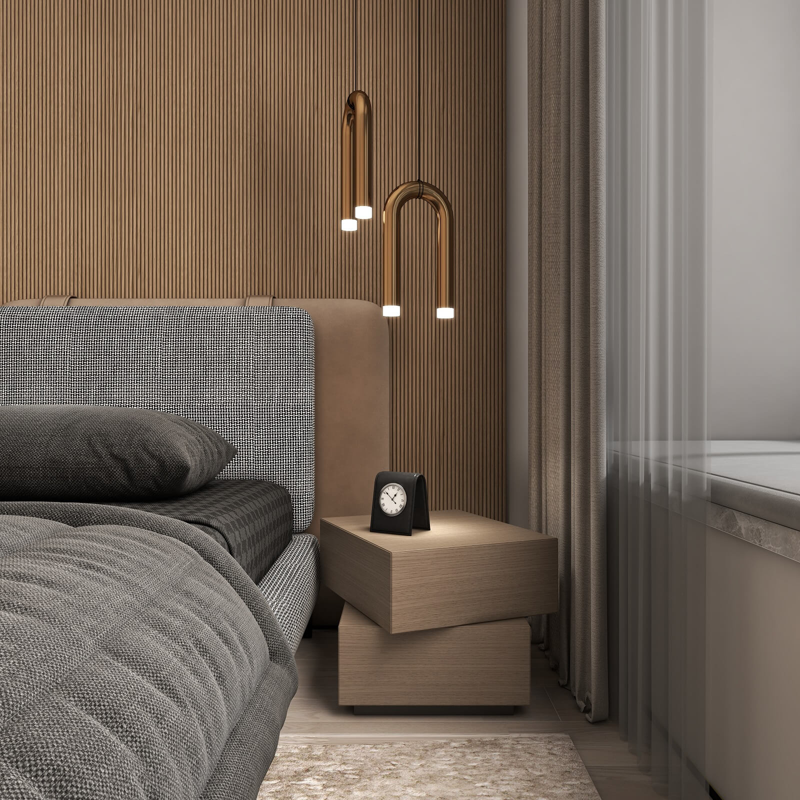 主臥的一切設計,都有助于睡眠氛圍的營造,黑棕色配合沉靜的物件,從材料到觸感,強調事物質樸的內在,能夠展示高端定制木作的本質之美。
